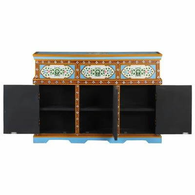 The hand-painted storage cabinet is made of solid mango wood and is highly stable and durable. Mango wood is hardwood with dense grains. It has the strength to bear the weight and also stands for the wear and tear of time. Every step of the construction process is carried out with the highest care, be it polishing, painting, or lacquering. It has 3 drawers and 3 doors which provide ample space for keeping your various items organized. It can also be placed in the hallway as a console cabinet.