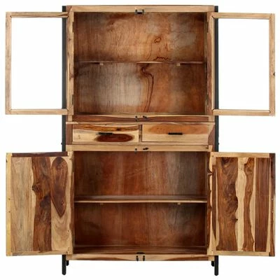 The storage cabinet is made of solid Sheesham wood, a tropical hardwood that is famous for its rich grains and also known as rosewood or palisander. Every step of the process is carried out with the greatest care, be it polishing, painting or lacquering. The sideboard is fully handmade, and the craftsmanship adds to its spectacular retro style. Thanks to the 2 glass doors, 2 drawers and 2 wooden doors, the highboard offers you large storage space for keeping your items organized. The product is easy to assemble.