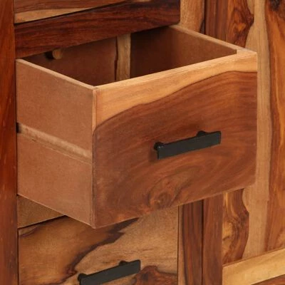 The side cabinet is made of solid Sheesham wood, which is also known as rosewood or palisander, a tropical hardwood that is famous for its natural grains and smooth texture. The three drawers and the shelves provide ample storage space for organizing your small items as well as protecting them from dust. The craftsmanship adds to the cabinet’s vintage style. Every step of the construction process is carried out with the greatest care, be it polishing, painting and lacquering.