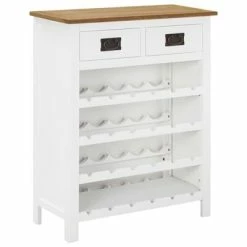 This bottle holder has a top made of solid oak and MDF with oak veneer, featuring a solid acacia wood body. The wooden wine cabinet consists of two parts. One part is the open wine racks, providing ample space for wine lovers to store wines well organized. The other one is two drawers that can be used to place other essential items.